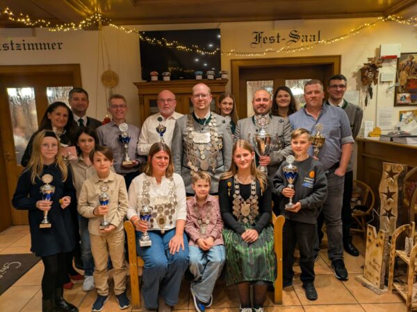 Neben unseren Königswürden haben wir ebenfalls weitere Pokale an unsere erfolgreichen Schützinnen und Schützen vergeben können. Den Pokal in der Schützenklasse sicherte sich Wolfgang Grau, in der Damenklasse – neben ihrem Königinnentitel – Karin Weis, bei der Jugend Ida Förstel und in der Schülerklasse mit dem Lichtpunktgewehr Lio Zametzer. Den Pokal für Luftpistole sicherte sich Johanna Scherl. Zum vierten Mal wurde der Pokal zu Eisernen Hochzeit von Martin und Cilli Kreller vergeben. Hier hatte Tobias Zametzer den besten Treffer. Der Passivenpokal, gestiftet von unserer nicht mehr passiven Schützin Lisa Wagner, gewann Klaus Leuker und die Familienscheibe, gestiftet von Lio und Marco Zametzer, ging an Maximilian und Kathrin Dahmen.